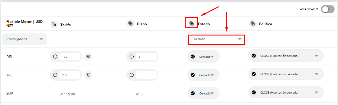 Se pueden editar habitaciones individualmente cliqueando sólo el estado de la misma, o todas las habitaciones juntas desde la opción de “+” al lado de “Estado” y luego en el campo que va a aparecer abajo colocar "Cerrado". Se colocará la política por defecto de "CLOSE" para que el tarifario se cierre de forma correcta.