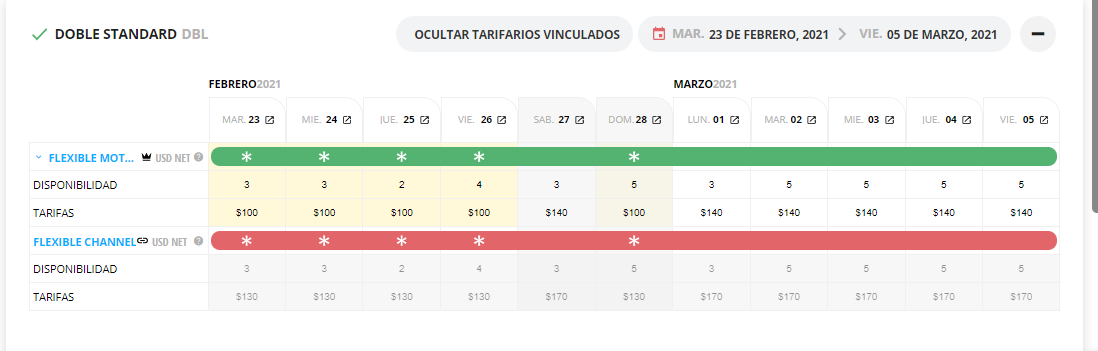 9- Los cambios realizados se visualizan volviendo al módulo Tarifas y Disponibilidad. En color verde se visualiza el tarifario "abierto" y en color rojo el tarifario "cerrado".