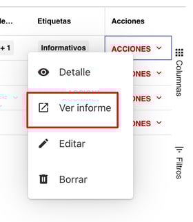 3- Cuando has encontrado el informe, hacer click en el menú de acciones a la derecha del informe y luego hacer click en la opción Ver informe