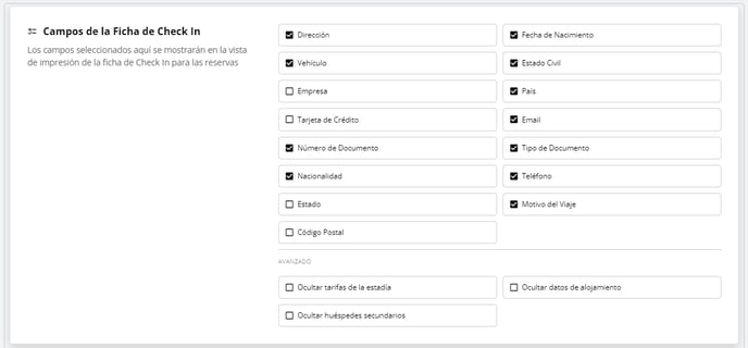 Se puede personalizar ciertas características de los campos de la ficha imprimible del Check-In (documento a completar en el front por el huésped en el caso de no haber realizado el web check-in de manera anticipada). Tilda los campos que requieras y guarda los cambios al final de la tabla.