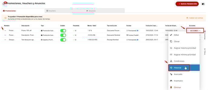 2 - A continuación, haz clic en la opción "Acciones" ubicada junto a la promoción o voucher que deseas consultar, y elige la opción "Historial".