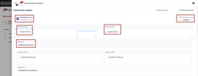 ¡Atención! Si se realizan cambios en las condiciones de una promoción o voucher, el historial de cambios indicará que hubo modificaciones en las condiciones, especificando quién realizó los cambios, así como la fecha y hora en que se efectuaron. Sin embargo, no se podrá visualizar de manera específica en cuáles de las condiciones se realizaron dichos cambios.
