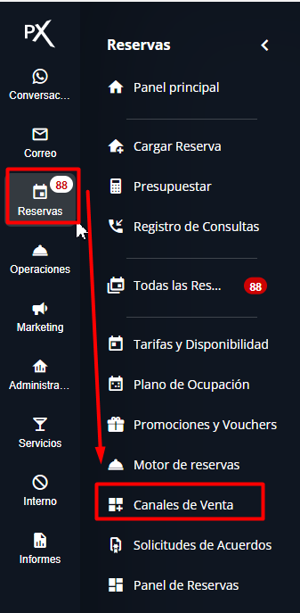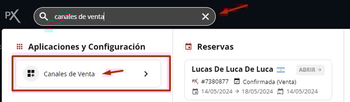 1- Desde el Omnibox buscar e ingresar a la aplicación "Canales de venta" o desde el menú lateral izquierdo ingresar a Reservas > "Canales de venta".