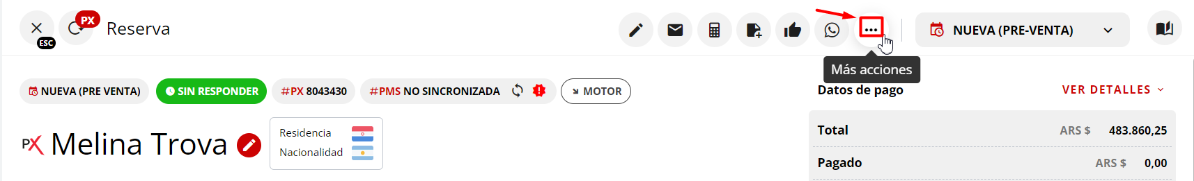 1 - Acceda a la reserva donde desea programar una acción o comentario y haga clic en la opción: "Más acciones":