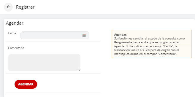 Su función es cambiar el estado de la consulta como Programada hasta el día que se programó en la agenda. El día indicado en el campo "Fecha", la transacción vuelve a su carpeta de origen con el mensaje colocado en el campo "Comentario".