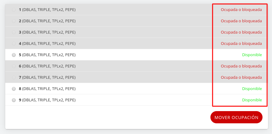 3 - Se abrirá una ventana que nos mostrará todas las habitaciones indicando si están disponibles o no