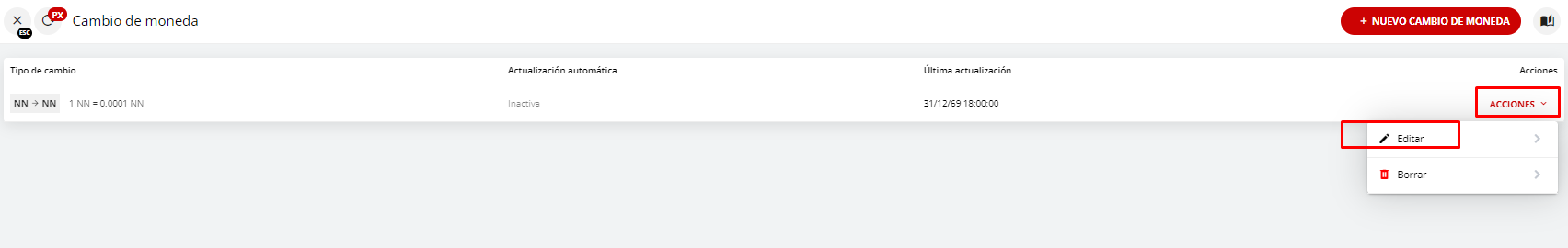 3- Dentro del módulo encontrará el botón + Nuevo cambio de moneda, presionar este para genera una nueva opcion de configuración. Una vez creado, solo deberá acceder a Acciones y editar.