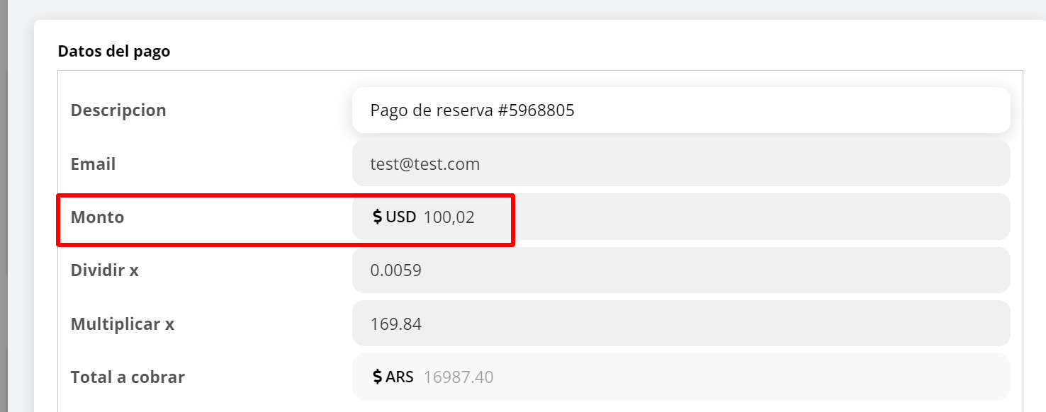 3- Encontraremos los datos del pago con el monto total a cobrar, el cual puede editar a mano en caso de querer cobrar un monto diferente: