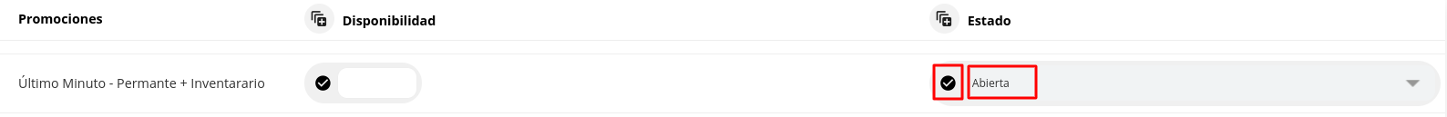6- Seleccionar en la Promoción creada el Check box en la columna Estado y la condición de Abierto o Cerrado según corresponda para los días seleccionados.