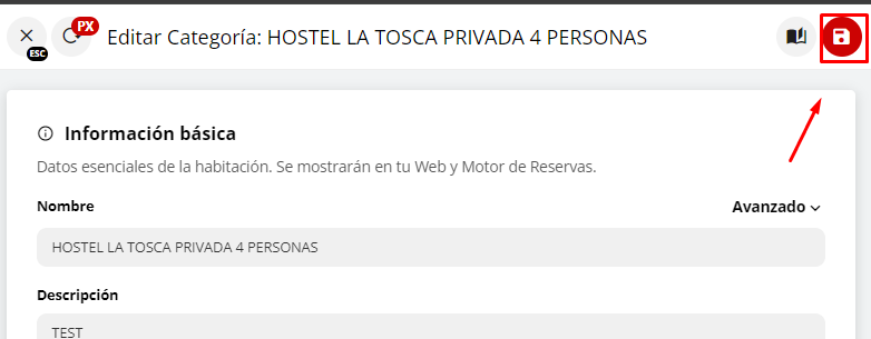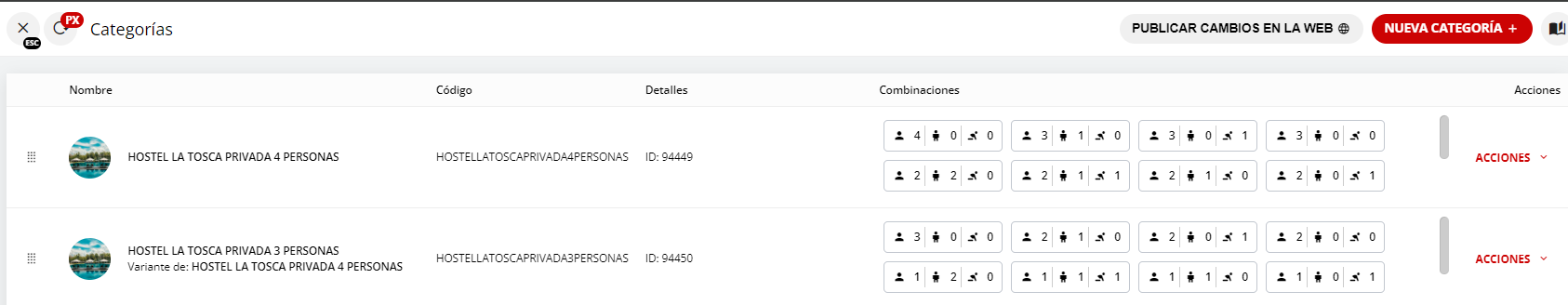 7- Una vez finalizado de colocar todas las combinaciones que admite la habitación, presionar GUARDAR CAMBIOS desde el botón que se encuentra en la parte superior o en la parte inferior.