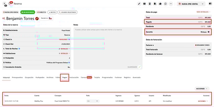 1.1 - Si la reserva es confirmada y el pago se procesa correctamente, el monto se acreditará automáticamente en la sección de pagos de la reserva.