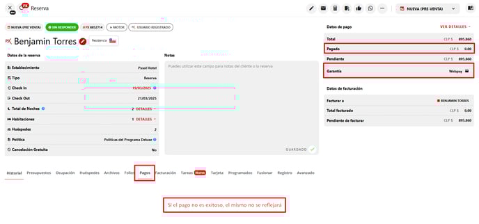 2.2 - En el Historial de la reserva, se registrará el detalle del pago, indicando que ha ocurrido un ERROR.