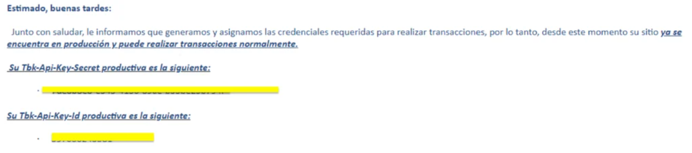 6 - Una vez que haya proporcionado la API Key al implementador, este procederá con las configuraciones restantes. Al finalizar el proceso, le notificará que la integración ya está activa y le solicitará realizar un pago real de 50 CLP, un requisito adicional establecido por Transbank para completar la integración.