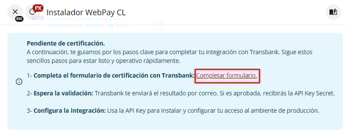 5 - Una vez que hayan completado el formulario, deberán esperar a que un implementador se comunique con ustedes para finalizar el proceso de conexión. El implementador llevará a cabo la certificación necesaria; si Transbank aprueba el proceso, recibirán una API Key que deberán proporcionar al implementador para concluir la integración.