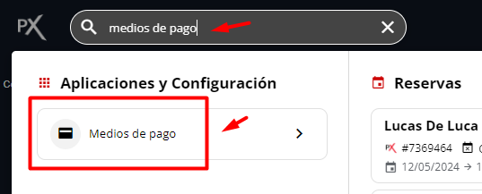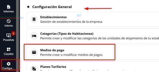 O desde el menú lateral en el apartado Configuración en la parte derecha hacer scroll (bajar) hasta la parte de Configuración General y hacer click en "Medios de pago".