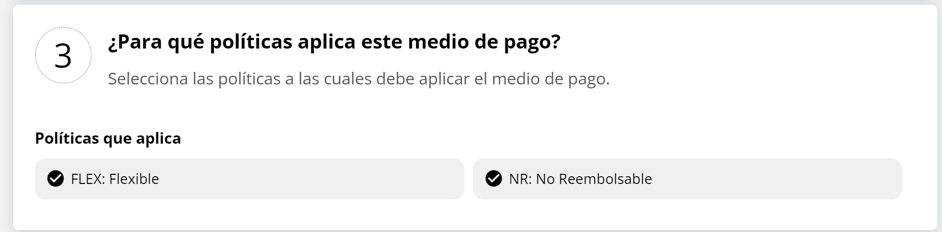 Este punto mostrará las políticas que previamente tiene configuradas para su establecimiento y deberá seleccionar una o más políticas para que aplique a este medio de pago.
