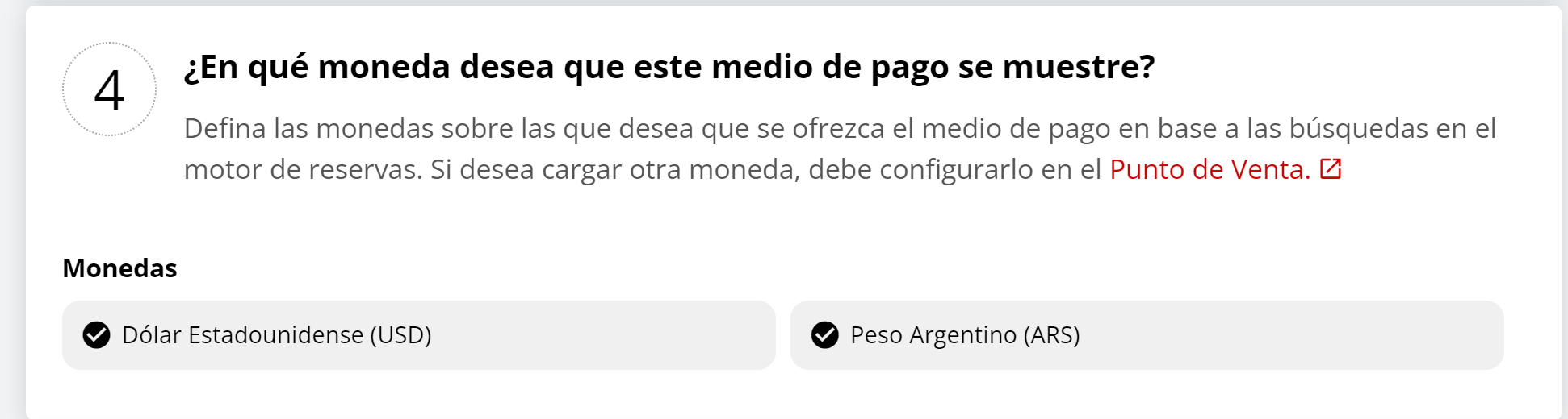 Podrá seleccionar una o más monedas para este medio de pago; si no selecciona ninguna por defecto se aplicará a todas. Seleccionar una moneda sirve para que en el Motor de Reservas, solo se muestren las búsquedas que coincidan con la moneda que se seleccione en este campo.
