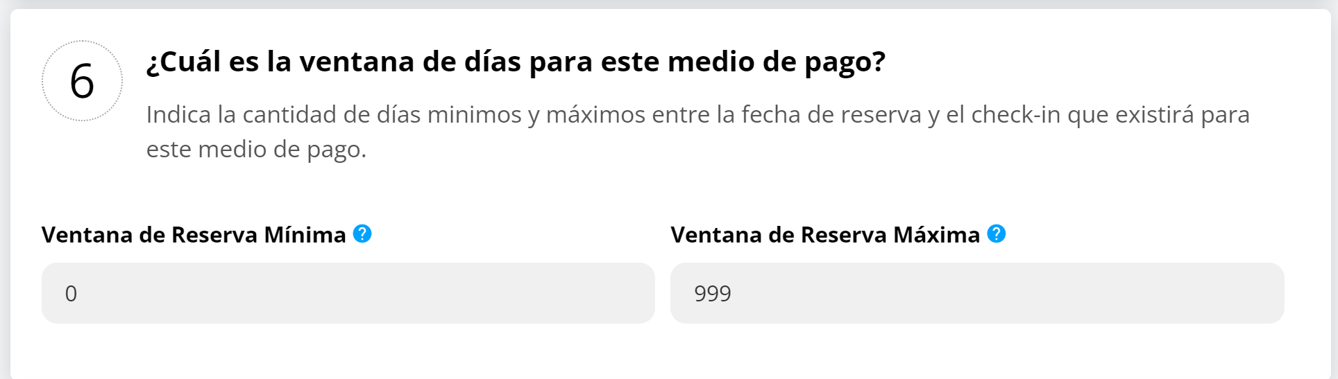 Por ejemplo si tienen transferencia bancaria y no quieren que entre la transferencia el mismo día de Check in pueden colocar Ventana de reserva mínima: 1 o 2 días.