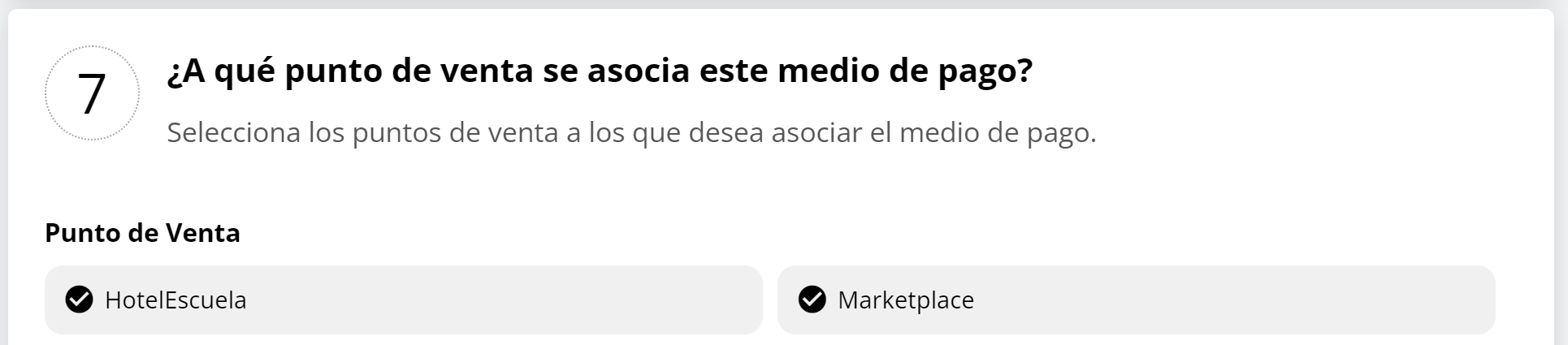 Si tiene sólo un punto de venta el medio de pago aplicará al mismo, en caso de tener más de un punto de venta configurado puede seleccionar uno o más puntos de venta para que aplique el medio de pago.