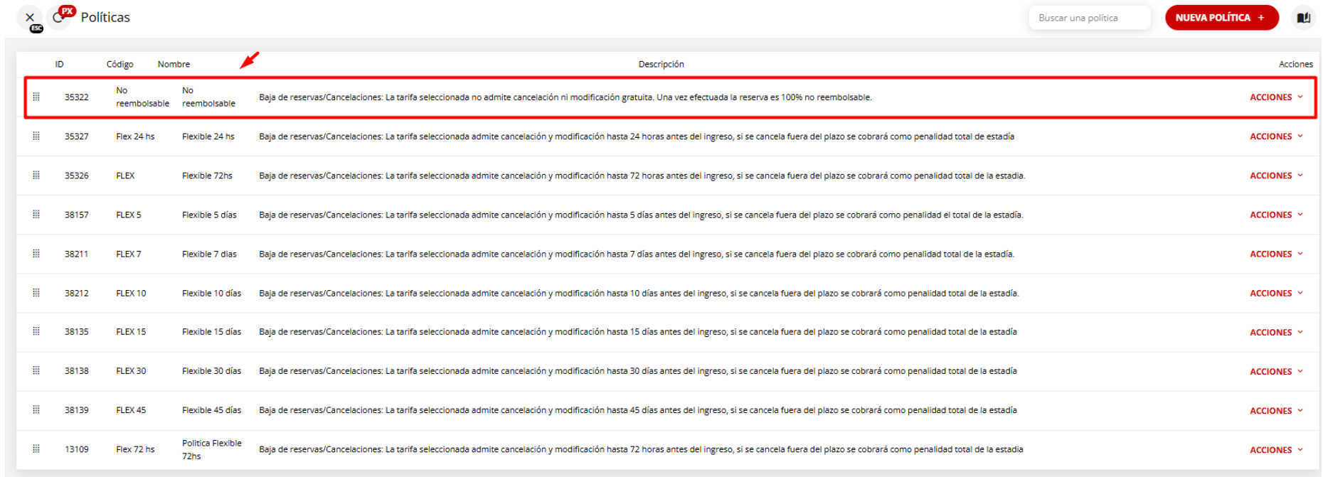 Las políticas son las que determinan las condiciones de compra y, a ellas, se asocian los medios de pago. Recuerda crear siempre primero la política más restrictiva, es decir, la No reembolsable, para asegurarte de cubrir todos los escenarios posibles.