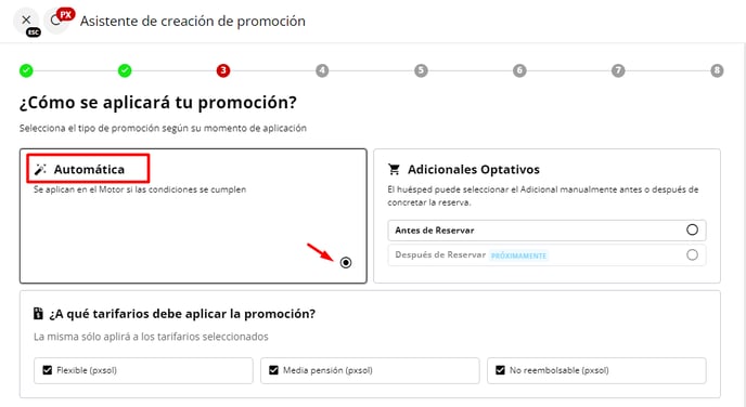 A - Seleccionar el tipo de promoción: "Automática". Esta opción permitirá que el fijo adicional se muestre en el motor de reservas siempre que se cumplan las condiciones establecidas, sobre la tarifa correspondiente.