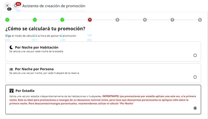 Las promociones que se aplican por estadía se efectúan una sola vez, y únicamente en la primera noche. Esta modalidad es adecuada para recargos de un monto fijo único, pero limita la aplicación de descuentos porcentuales, ya que estos se calcularán únicamente sobre el costo de la primera noche. Para recargos porcentuales, se recomienda optar por el cálculo "Por Noche".