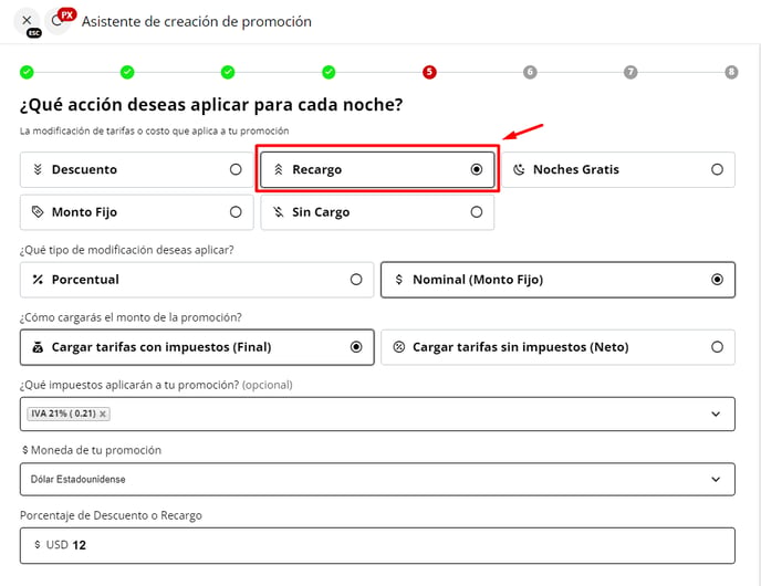 A - En caso de elegir la opción "Porcentual", se te pedirá que ingreses el porcentaje de recargo que se aplicará sobre la tarifa de la reserva.