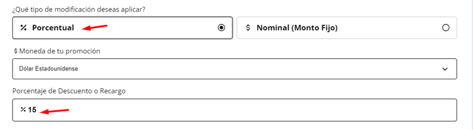 Se le solicitará elegir si recargo será de tipo Porcentual o Nominal.
