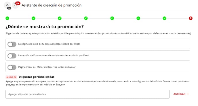 8 - En este último paso, no es necesario realizar ninguna configuración, ya que este recargo no debe aparecer en las secciones de promociones de la página web (si cuentas con sitio proporcionado por PXSOL) ni en el motor de reservas.