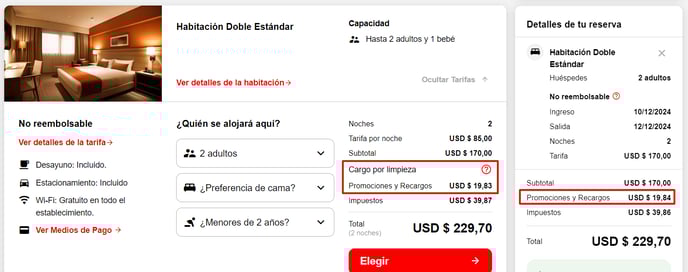 En el motor de reservas, el recargo se visualizará de la siguiente forma: