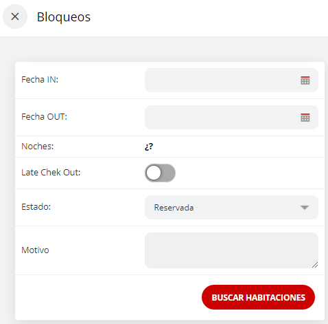 - Seleccionar Fecha de inicio (IN) y fin (OUT) del bloqueo y en Estado el motivo del mismo (Reservada o Fuera de servicio). Posteriormente, cliquear "buscar habitaciones".