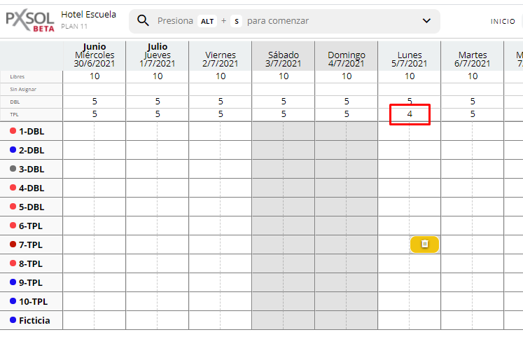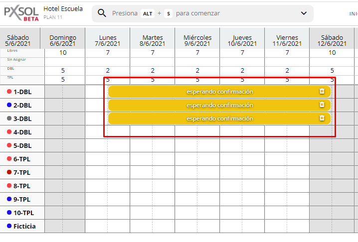 - El plano de ocupación se actualizará mostrando el bloqueo en las fechas y habitaciones correspondientes de color amarillo (si el estado es Reservada) o rojo (si el estado es Fuera de servicio).