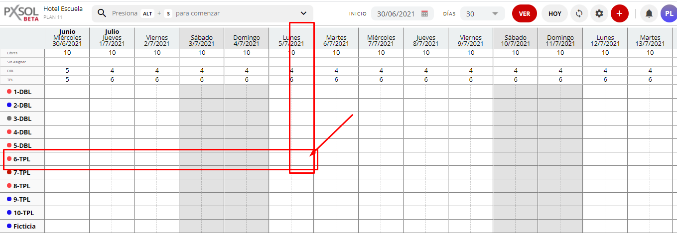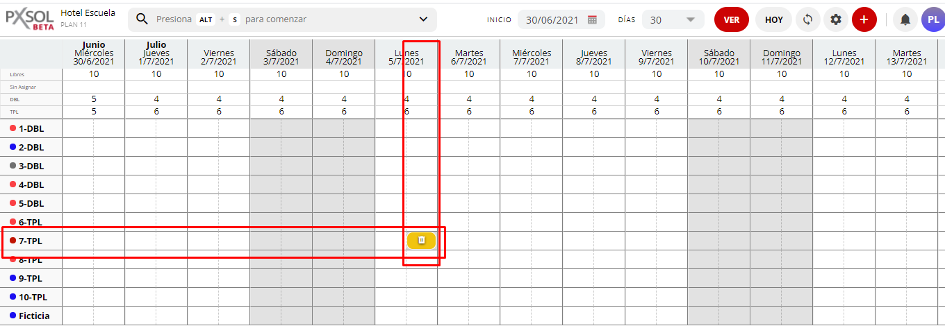- Dentro del plano se visualizará el boqueo para la habitación y día puntuales. En el ejemplo se visualiza que se generó el bloqueo para no vender la habitación 7 la noche del 05 de Julio.