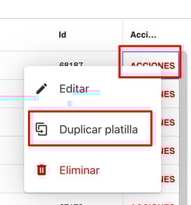3- A la derecha de la lista, en la plantilla que desea borrar, desde el menú de Acciones hacer click en el botón Duplicar Plantilla