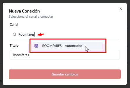 3 - Aparecerá una nueva ventana en la que deberás seleccionar el canal: "Roomfares" y proporcionar un título que identifique claramente esta conexión. Después de completar estos campos, haz clic en "Guardar cambios" para continuar.