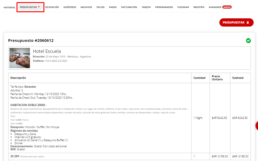 5- Dentro de la solapa de presupuestos se encontrará guardado el que se generó para esta consulta: