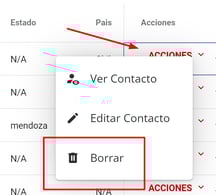 3- Una vez que encontraron el contacto, abrir el menú de acciones de la derecha y hacer click en Borrar