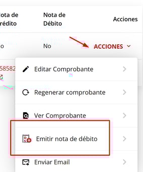 3- Seleccionar Emitir Nota de Débito en el menú de acciones de la nota de crédito que queremos cancelar
