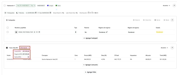 8- Dentro de la solapa de Habitaciones y Huéspedes, dentro de la habitación correspondiente, tendrá el detalle del alojamiento, total de consumos y el detalle del pago agregado, haciendo clic en la sección Información: