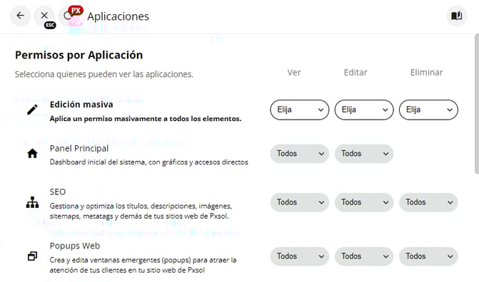 4- Visualizarán un listado de aplicación donde podrán configurar si desean que ese usuario pueda Ver, Editar o Borrar dentro de esa aplicación.