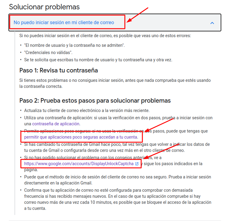 Deberán abrir dos pestañas, una seleccionando "permitir que aplicaciones poco seguras accedan a tu cuenta", la otra donde dice "https://www.google.com/accounts/DisplayUnlockCaptcha"