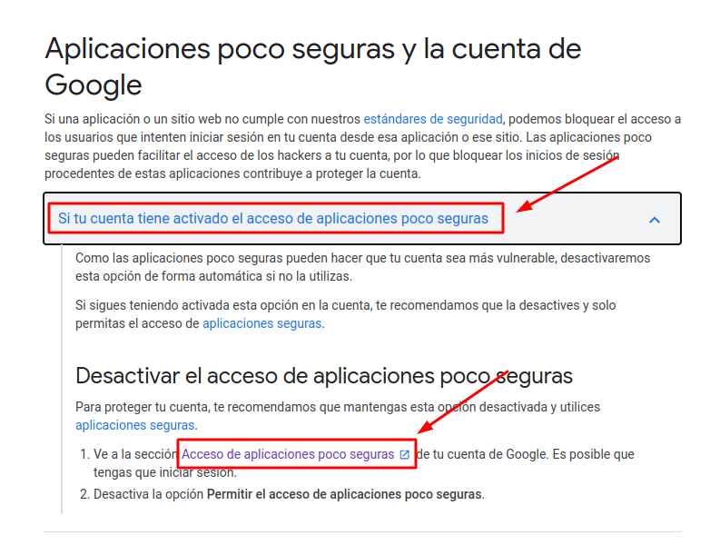 10- Al seleccionar "permitir que aplicaciones poco seguras accedan a tu cuenta" se abrirá la siguiente pestaña donde seleccionarán "Si tu cuenta tiene activado el acceso de aplicaciones poco seguras" y luego "Acceso a aplicaciones poco seguras"