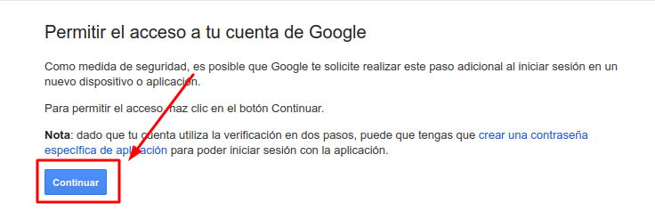 12- En la pestaña que se abrió al seleccionar "https://www.google.com/accounts/DisplayUnlockCaptcha" deberán seleccionar Continuar