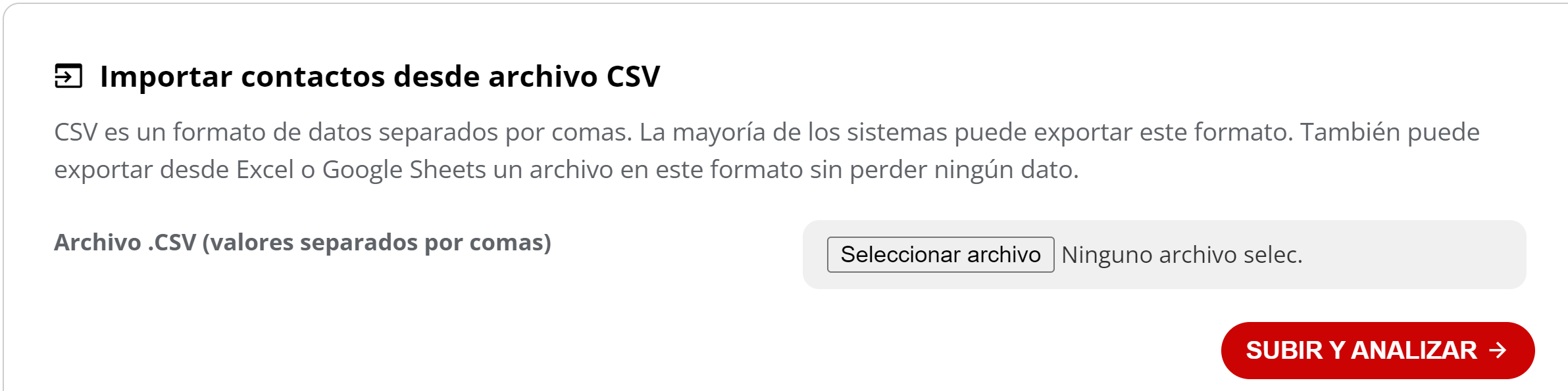 6- En la aplicación de contactos, subir el archivo que guardó en formato csv. Hacer click en el botón SUBIR Y ANALIZAR
