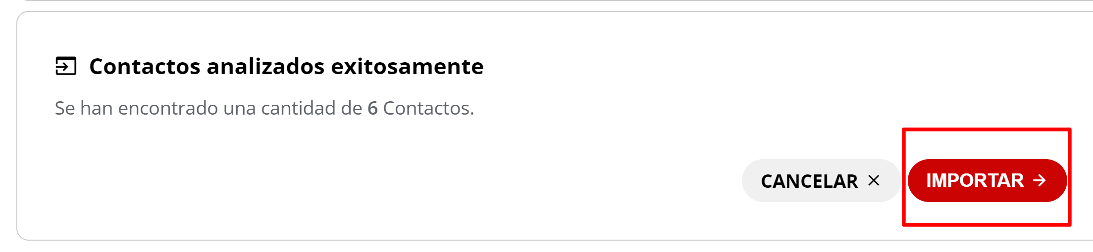 El sistema mostrará una notificación de los contactos que han sido agregados exitosamente y cuántos tenían error por datos mal cargados o campos vacíos