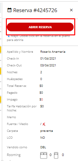 3- Cliquear sobre la reserva dentro del plano, se abrirá una ventana lateral derecha con los datos de la misma. Seleccione ABRIR RESERVA: