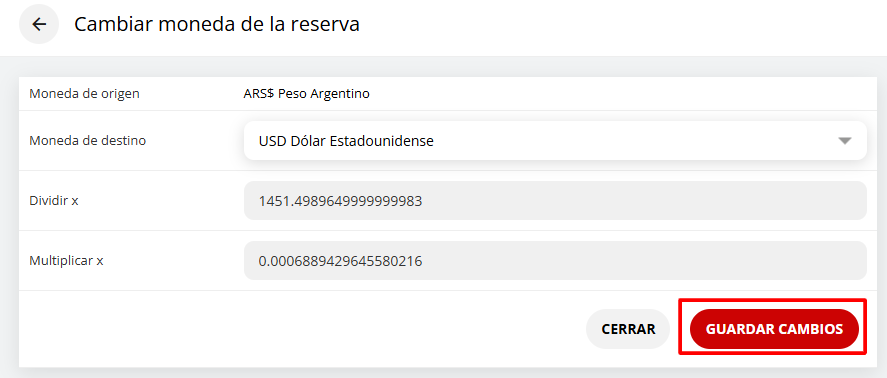 3- Seleccionar la moneda a la cual desean cambiar y colocar el tipo de cambio ha aplicar. Luego, clicquear Guardar Cambios.