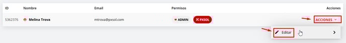 1 - Accede a la aplicación "Usuarios", selecciona el usuario para el cual deseas configurar la zona horaria y haz clic en "ACCIONES", luego en "EDITAR".