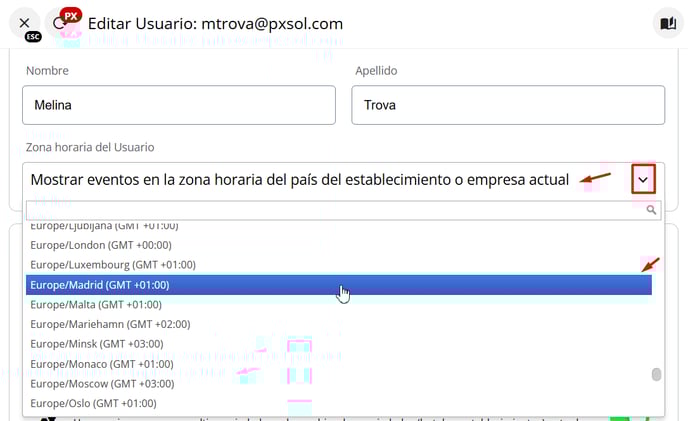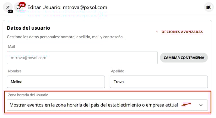 La zona horaria del usuario se establece, por defecto, según la configuración de zona horaria del establecimiento. No obstante, si es necesario, esta puede ajustarse individualmente para cada usuario, permitiendo visualizar todos los eventos en la zona horaria deseada. Cabe destacar que cualquier configuración de zona horaria aplicada a nivel de usuario sobrescribirá la configuración general del establecimiento.