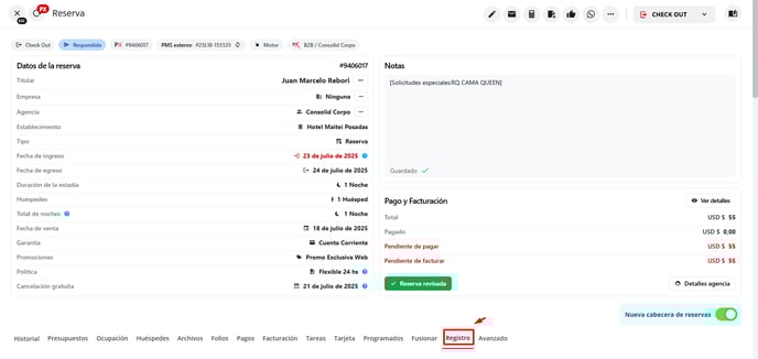 2 - Al estar en la reserva, seleccione la pestaña "Registro".